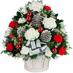 A whitewash basket is arranged with an upbeat floral arrangement for the Holidays. Featuring white and red carnations , white flowers, a variety of seasonal greenery, red balls, silver pinecones and lush silver ribbon.