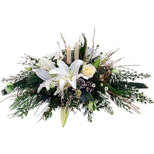 Winter Wishes. Beautifully trimmed holiday centerpiece with two white candles, snowy white lilies, white or cream roses, frosted pine cones, delicate white flowering accents and ample seasonal greens and decorative twigs.