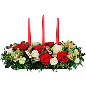 Premium designed long low table centerpiece featuring white roses, red roses, exotic cymbidium orchids, gold painted greenery, berries, holly and 3 red taper candles. A triumph!