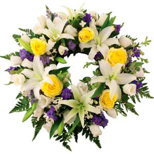 Family Wreath. Fresh flower wreath arrangement of seasonal blooms - a traditional floral wreath offering for times of sadness and loss.