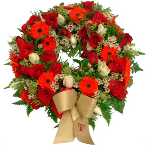Red Sympathy Wreath. This classic combination of beautiful red roses, red gerberas and white roses make this one of the finest wreaths.