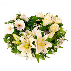 White Lily Rose Funeral Wreath. This classic combination of beautiful white roses, white gerberas and white lilies make this one of the finest wreaths.